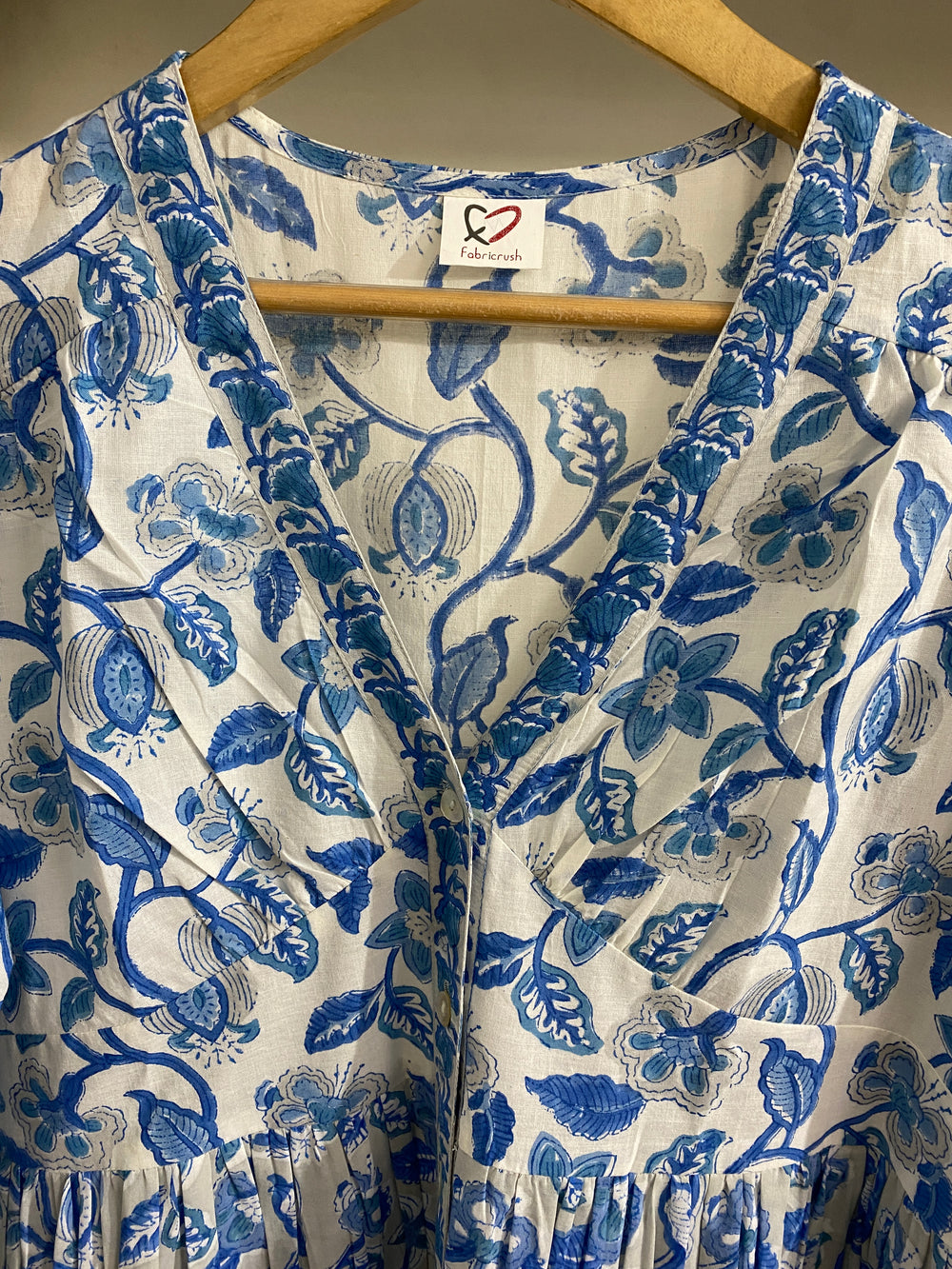 Step into effortless elegance with this hand block printed cotton midi dress in refreshing shades of blue and white. Featuring intricate floral patterns inspired by traditional craftsmanship, this dress blends heritage artistry with modern comfort.