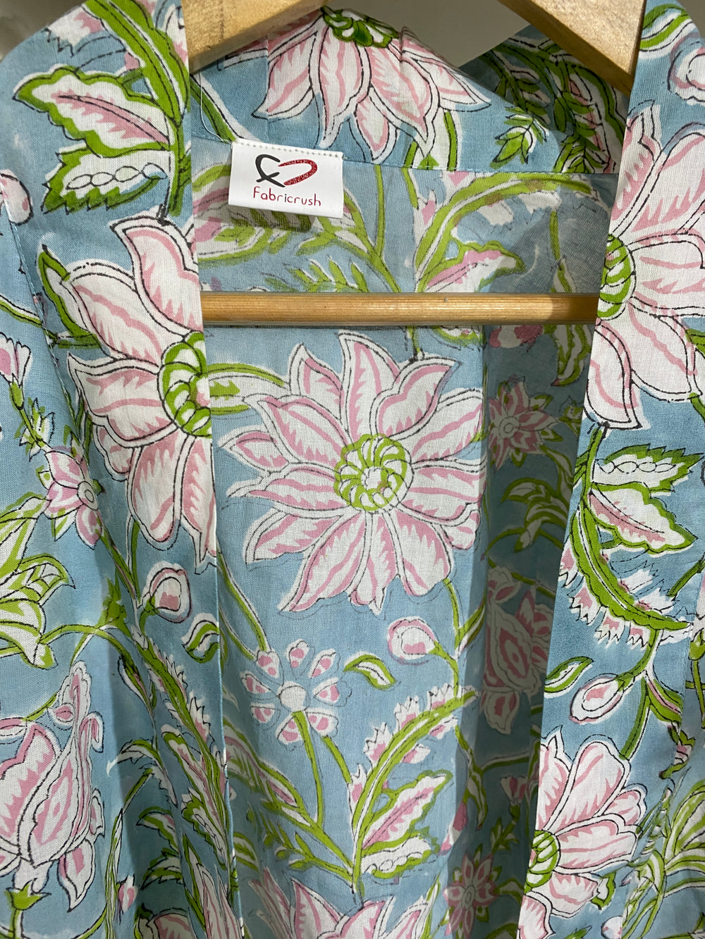 Bring a touch of breezy elegance to your wardrobe with this hand block printed kimono in soft aqua blue, adorned with delicate pink and green floral motifs. Crafted from lightweight cotton, it drapes effortlessly, making it a versatile layering piece for both casual and chic looks.